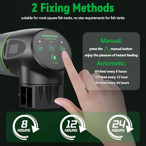【Manual & Automatic Modes Fish Feeder】The SYSENCIAGA automatic fish feeder allows your fish to be fed at any time. This aquarium automatic fish food dispenser has 3 intelligent interval modes, which can be automatically rotated every 8 hours, 12 hours, 24 hours, or 48 hours. In addition, you can manually feed at any time, just press the manual button to enjoy the pleasure of instant feeding. Our automatic fish food dispenser automatic turtle feeder will help you prevent your fighting fish from starving when busy, on vacation, or out